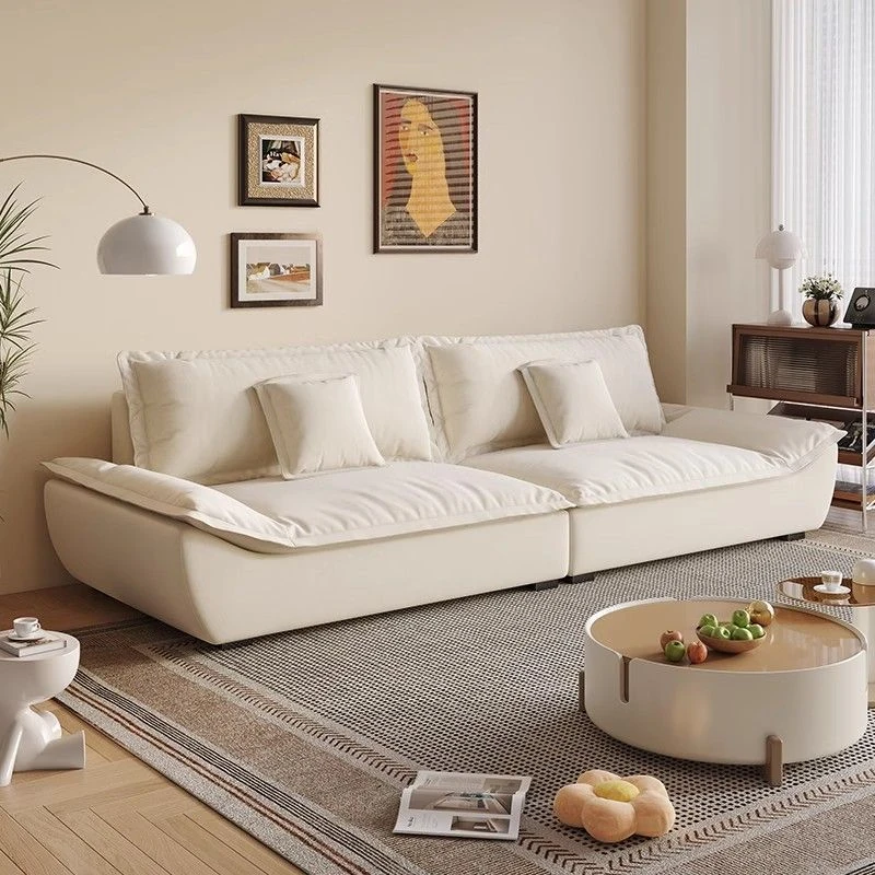 クリーミーなマシュマロソファー|小型リビングにぴったりのトレンド布製|ダブル3人掛け|ふわふわのラムファーで快適なリラックス空間を実現!