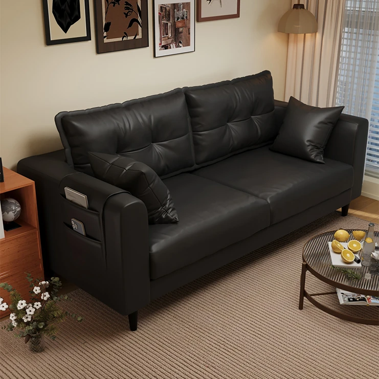 モダンでシンプルなデザインの中古風レザーソファ!小さなリビングにもぴったりな2人掛け・3人掛け、リラックスできるブラックのラウンジソファ。おしゃれな空間を演出し、居心地の良いひとときを提供します!
