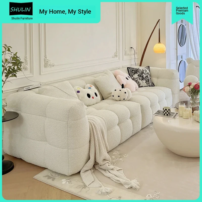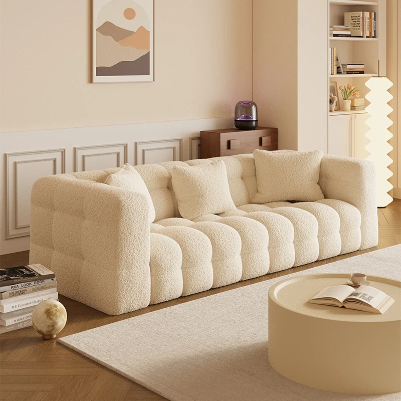Creamy Cotton Candy Sofa for Small Living Rooms - Trendy Double Three-Person Lamb Fleece Fabric Couch, Perfect for Cozy Spaces and Relaxation.